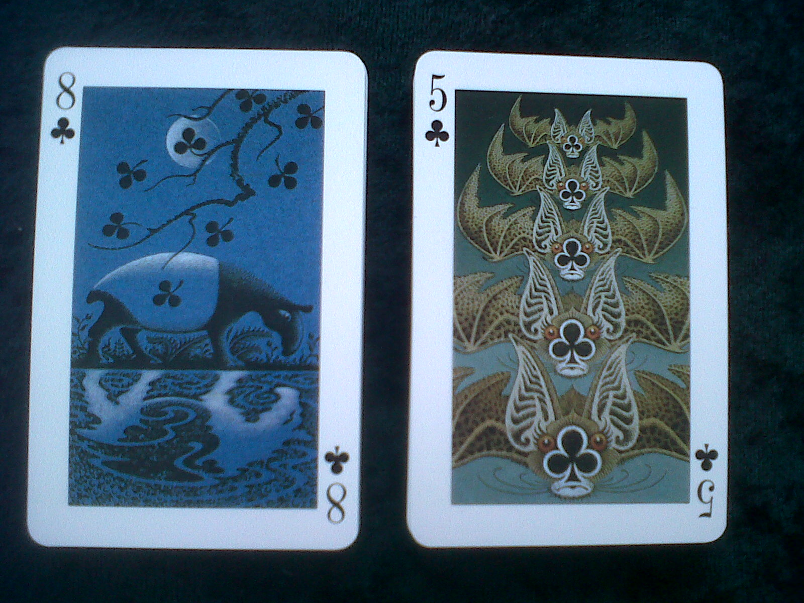 This deck is a pack of 52 transformation cards – these are cards where the conventional suit signs of ordinary playing cards have been replaced or transformed into designs of a more imaginative flavour… They first appeared in 1806 in Germany and if you care to know more about that, then hey! go google… big hint: J.C.Cotta…