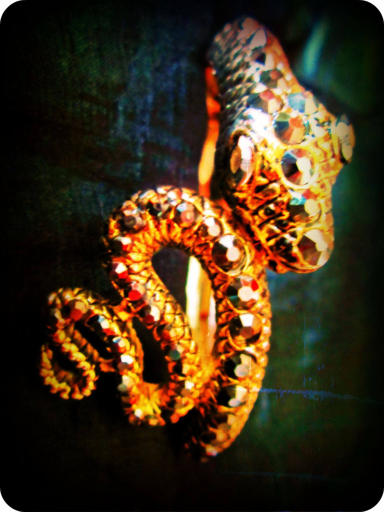 And she starts to chat and say that she had never had a reading before… and my eye is caught… Both of her arms are rich with bangles and on her right arm, there sitting between rows and rows of beads of many colours, I catch sight of a glint of a shine… a flash of light… a shiny, shiny, ssssssssnake….