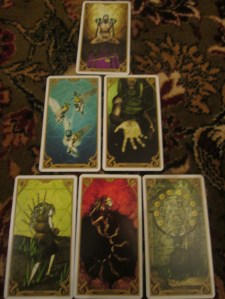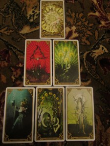 So all these thoughts and a few more I forget whirl around and soon I’m heading away to play with Night Sun Tarot… I lay out my Birth Chart Mandala to see what I can hear…