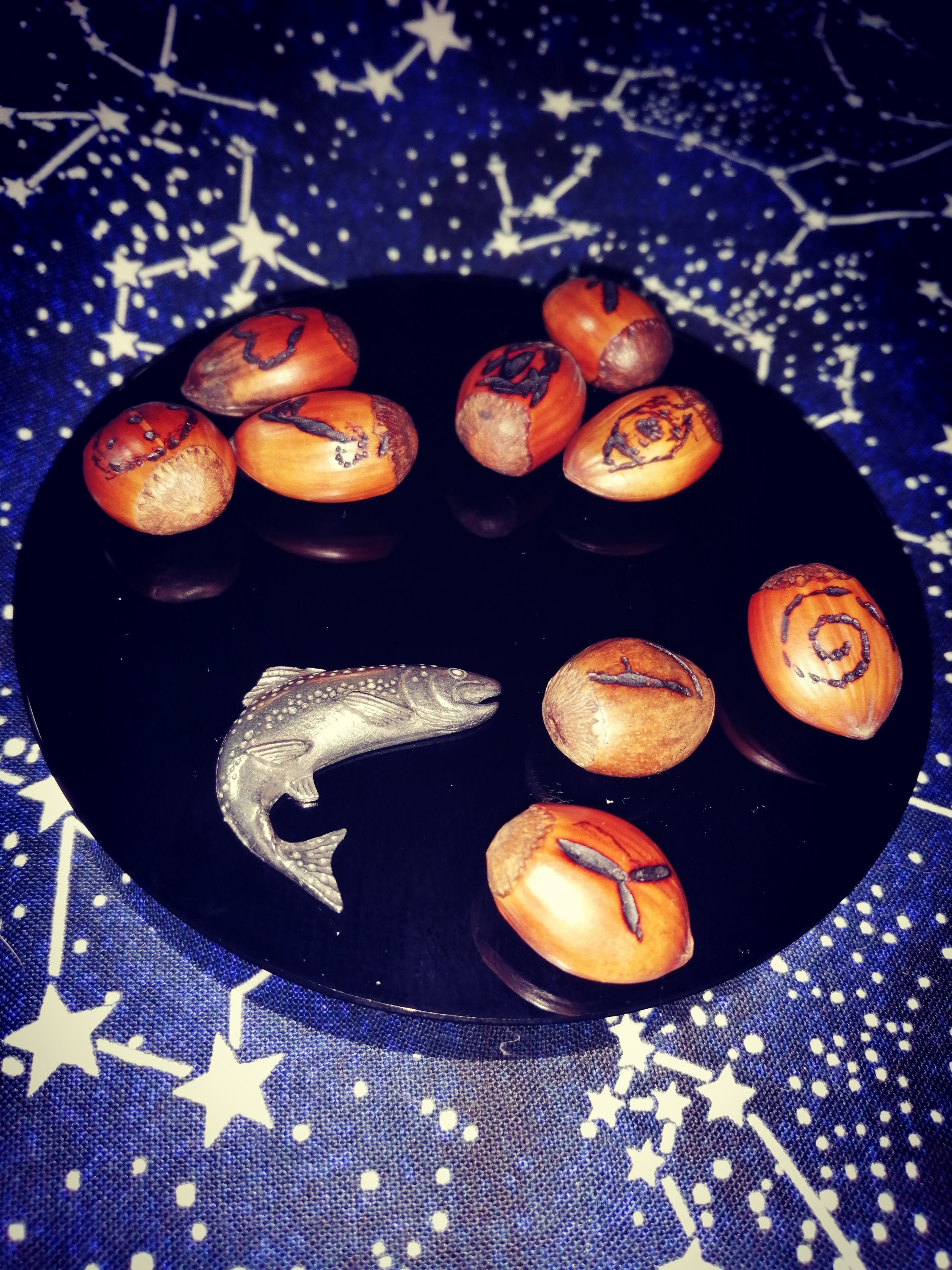 Fairies like to 6 of Pentacles reciprocate, they’d spoken to me in dreams… Gather 9 nuts from beneath the tree and source a salmon… The nuts were easy… the salmon took a little longer… Once gathered they showed me symbols to burn (though I’m guessing they didn’t intend me to also brand the end of one of my fingers in the process… but you never know…)