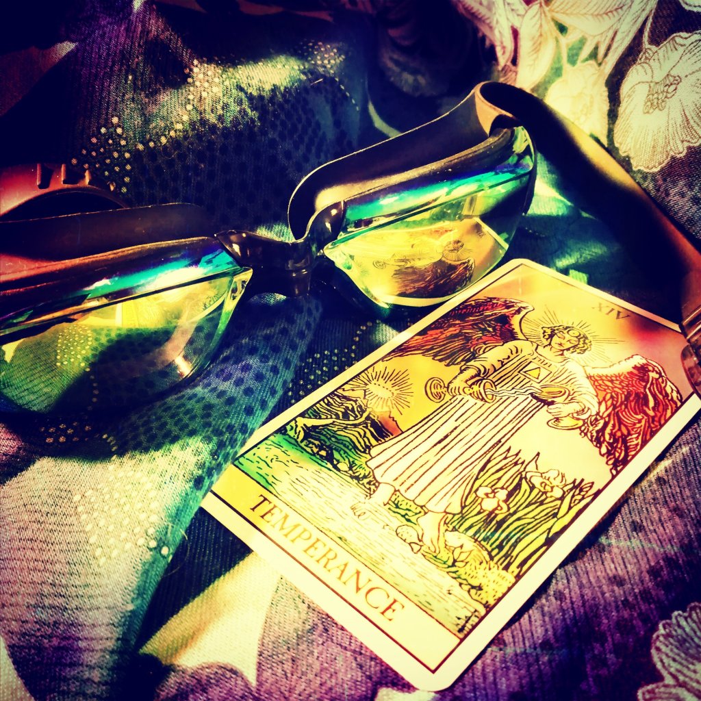 So… at the pool today, a guy catches my eye as he purposely strides from the entrance, along the side of the pool and up to the deep end… it gets my attention as mainly the men who show up on a Friday shuffle down the steps with hand rails into the shallow end in a way that makes me think that they can smell their own mortality and feel the presence of the reaper closing in not far behind them… So this guy with zest and symmetrical gait turns my head for a closer look… I notice a XIV about 8 inches high across his left pectoral muscle and I smile as I see emblazoned across his right deltoid trailing down his back, an angel’s wing and it fills my little tarot heart with glee to think that Temperance has just landed at the water’s edge…