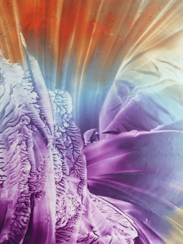 As I look at today’s waxing, it feels to be a good fit for the season. Last night the clocks went back, marking the end of BST…Autumn is in its final fling before Winter sets in… I have mixed feelings about this time of year… I like that there’s a brief respite from the dark mornings, that for the next couple of weeks, I’ll be starting my day in sunlight already risen, that on good days, the rays will hit the trees just so and make the leaves look like shimmering drops of amber, amongst fiery reds, glowing burnt oranges and scattered shades of purples… I don’t like so much that my evening runs will be plunged into darkness…A reminder that soon mornings and evenings will be hard to tell apart and in between will be the dismal greyness that befuddles time – what time is it now? Time to get up or time to go back to sleep…Sleep…I think back to this morning’s dream, a golden gift landing on the back of this extra hour which allowed me to stay a while longer under the duvet rather than leap into the day…I look at the face in the waxing…dead to the world…but inside that head…dreams coming to life… I look again at the head…There’s something familiar about it…Something to do with my garden…I stroll outside…oh yes…of course!