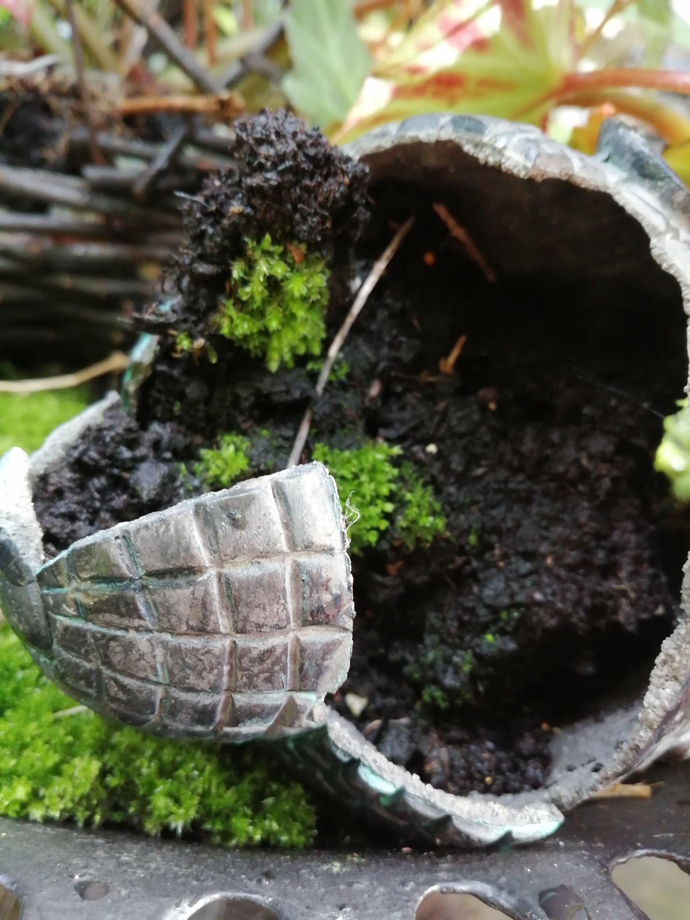 The Broken Buddha…once a large statue sat in a quiet corner…Serene and whole until an idiot neighbour decided to yet again try and cut down the tree that refuses to quit growing back…A thunderous crash as the once vertical greenery became horizontal across the end of our garden. The side panels of fencing wiped out in the ill thought out pruning and under all this carnage the Buddha laid out and left for dead… I’m not sure what happened to his body, but the cracked opened head was kept until a time would come to repurpose it and give it new life… The Broken Buddha found its new home in a cracked bird bath. The bird bath nearly got dumped as what use is a cracked dish that will not hold water? Hmm…A cracked dish that won’t hold water? Hmm…that sounds like a planter with perfect inbuilt drainage…so the bird bath and the Buddha were both filled with compost and soil and plants and lived happily as soul mates… I think about deciduous trees and how some things are for a season… I look inside the Buddha’s cracked open skull filled with black earth…filled with bright life…I ponder that maybe in the dark places of our minds is where our evergreen thoughts abide… Things that are always growing there, not for a season but for a reason…